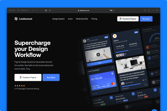 Lookscout is a premium figma design system and ui kit that strives to help ui/ux designers supercharge their webflow. It comes packed with hundreds of premade designs, the latest figma features and a custom icon set with more than 5,000 custom icons. The Lookscout design system makes it easy to design any interface ranging from responsive websites, dashboards to mobile applications in both light and dark styles.